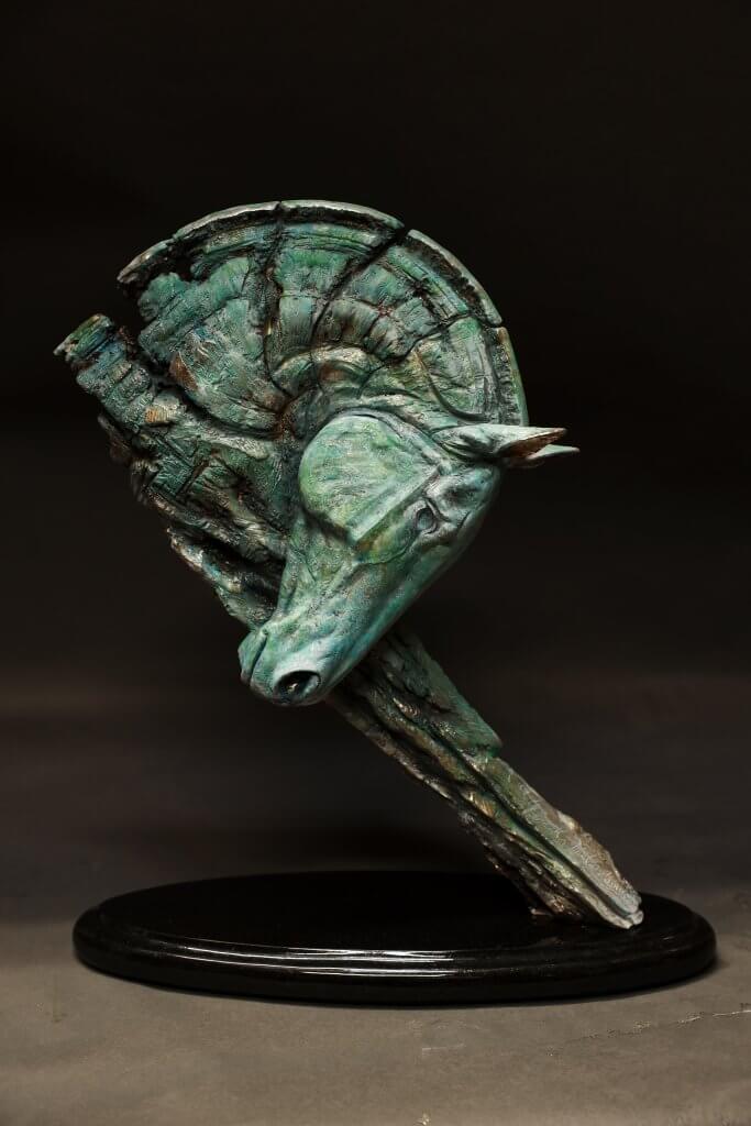 This sculpture is built around its heavy, rugged textures with Steve using big lumps of clay and cumbersome tooling work to portray the feel of stone as though an ancient relic from centuries ago. This harsh surfacing created is completely juxtaposed to the delicate and balanced composition designed and masterfully crafted by Winterburn, the large body of metal, flows round from the focal point of the head to the elegant support it stands upon.